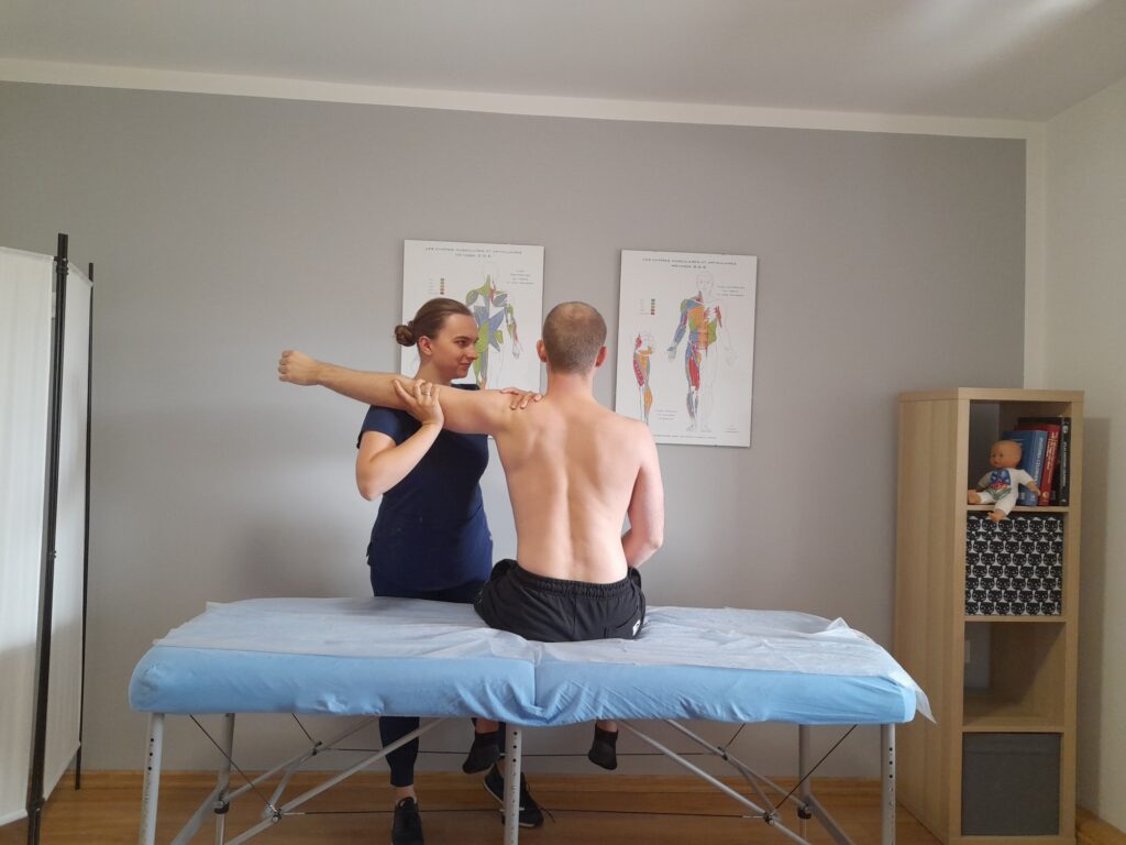 Dopiero podczas badania manualnego zauważyłam, że napięcia w okolicy obojczyka, pierwszego żebra oraz mięśnia piersiowego mniejszego uciskały nerwy i tętnicę podobojczykową – typowy zespół otworu górnego klatki piersiowej (TOS).