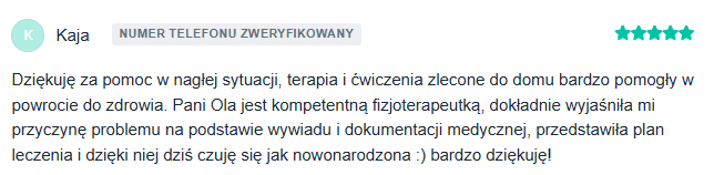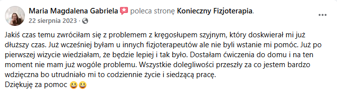 Już po trzech spotkaniach bóle głowy ustąpiły niemal całkowicie – pojawiły się jeszcze tylko raz, w znacznie łagodniejszej postaci. Magda wróciła do aktywności i z uśmiechem przyznała, że musiała nauczyć się oddychać od nowa i że dopiero teraz czuje, jak bardzo napięcia w szyi wpływały na jej codzienne funkcjonowanie.